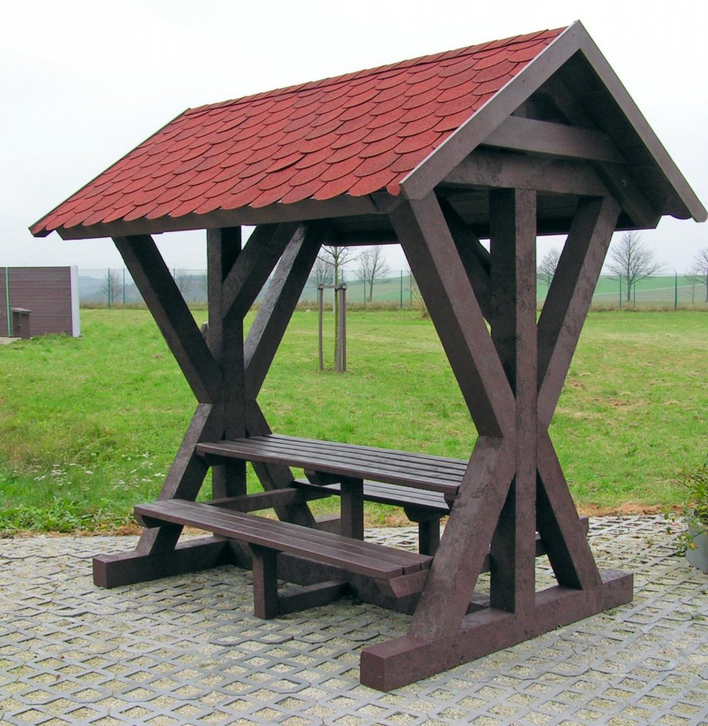 Ob es regnet oder schneit: Die Kunststoffbank Grand Canyon sorgt stets für einen trockenen und zugleich bequemen Unterschlupf. Das heimelige Dach lädt zur Rast ein, und auch eine kleinere Wandergruppen finden Platz.